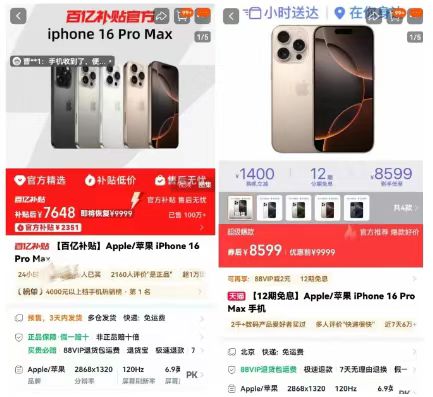 淘宝/拼多多/京东不定期推出“百亿补贴”,本质是平台自掏腰包把热门电子产品的售价打骨折。以刚上市的 iPhone 16 Pro Max 为例,补贴价比官网日常价低 800——1 200 元不等。只要你能拿到货,转身加价 300——500 元卖给线下渠道或二手回收商,差价就到手了。