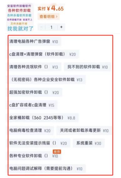 除了流氓软件,电脑日常杂症都是金矿:C盘爆红、顽固图标删不掉、打印机失联、系统卡成PPT……任意一条单拎出来,都能做成“小单价×高复购”的虚拟服务。套路统一:找到抓狂的小白,把解决方案做成标准化教程+远程脚本,一份时间反复卖。