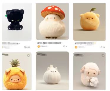 把关键词换成「奶蓝小猪头顶蓝莓,短腿 Q 版,绒毛材质,极简光追」,又能秒出新款。批量出图,效率爆炸。