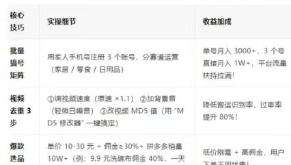 - **多多进宝选高佣品**:优先选**销量10万+、佣金10%以上**的商品,避开医疗、山寨品。