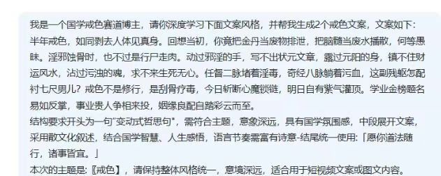 优质文案是视频成功的关键。建议采用DeepSeek等AI工具辅助创作,通过精准的指令生成初稿(具体指令详见文末)。生成后需人工审核,确保内容既符合平台规范,又能准确传达国学智慧与戒色理念。