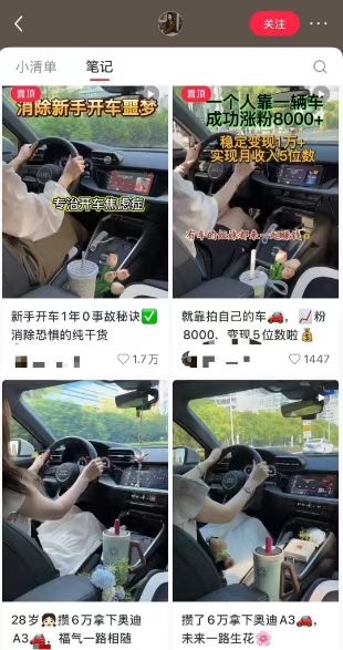 奥迪小琪(女) | 小红书8.2万 | 中控台+穿搭+油耗 | 1.2万——1.5万 | 接汽车香片、手机支架、车载吸尘器等广告,**投流成本每月3000+